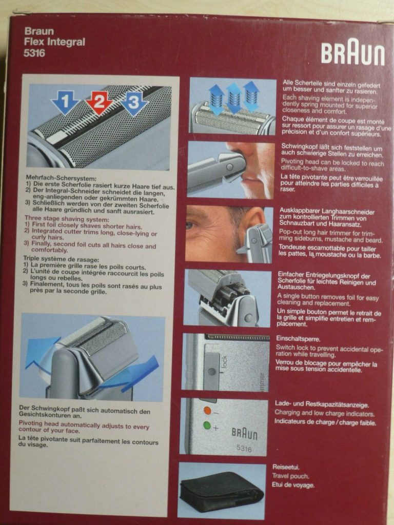 Ungefähre Beschreibung in Deutsch (Descripción aproximada en alemán): Elektrorasierer Flex Integral universal 5316