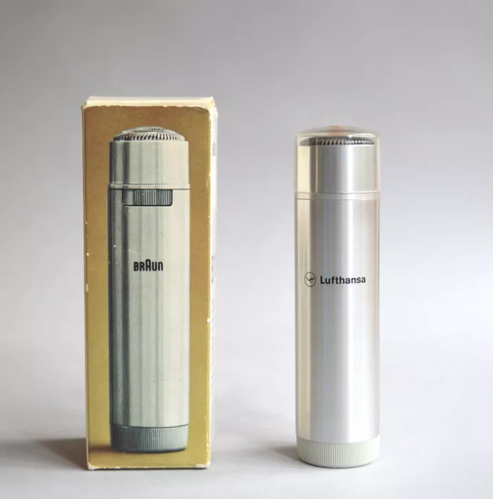 Maquinilla de afeitar de viaje a pilas. Este ejemplar es una personalización para Lufthansa usando el diseñado por Otl Aicher para la compañía aérea; probablemente se ofreció como regalo a bordo.
