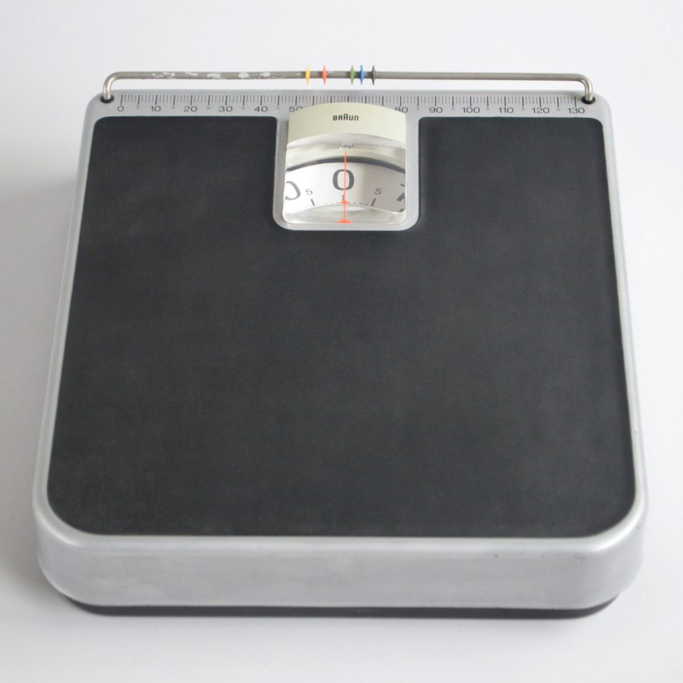 El uso de la simetría es uno de los parámetros del funcionalismo proclamado por Dieter Rams; una de las excepciones a este principio se puede apreciar en esta báscula en donde la posición de los indicadores de colores registran los pesos de los diferentes miembros de la familia.