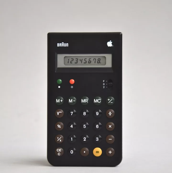 Esta calculadora con el logotipo de Apple estuvo disponible en la tienda de regalos de Apple en 1982 y apareció en el catálogo de estilo de vida «Apple Collection 1986/1987» y «Apple Collection 1987/1988».
