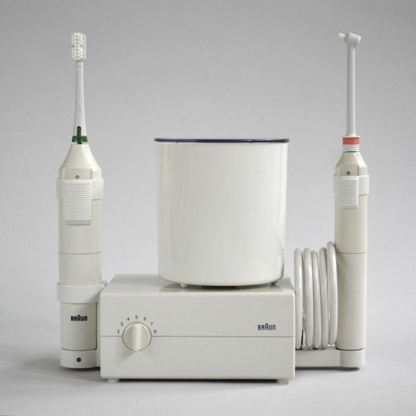 Centro dental de configuración simétrica y rigurosamente articulado por Peter Hartwein. Un discreto retorno al estilo funcionalista dentro del programa Braun: una combinación de estética médica y de refinería de petróleo que recuerda los diseños de Weiss de principios de los años 60, en particular el ventilador de escritorio HL 1.