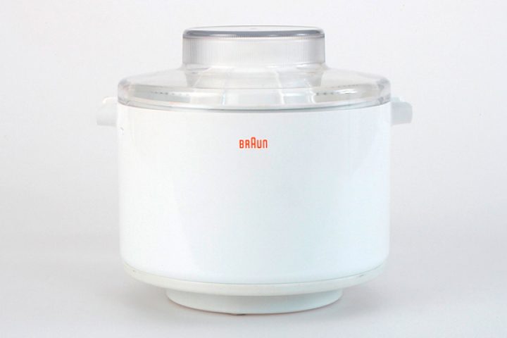 Organizado en una forma de cruz: tapa y base en vertical y salida del zumo doble en horizontal. Internamente, el volumen del bloque motor penetra en un recipiente con forma de toro. Esta integración de piezas se expresa externamente en la forma de la carcasa. Su línea continúa ininterrumpida hasta el hombro de la tapa. El recipiente se separa del bloque para servir como jarra de mesa; el cono se levanta para revelar un exprimidor de limones interior con platillo integrado.