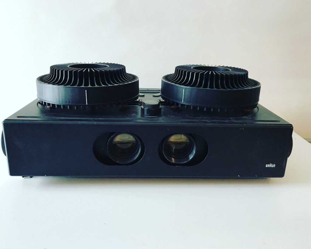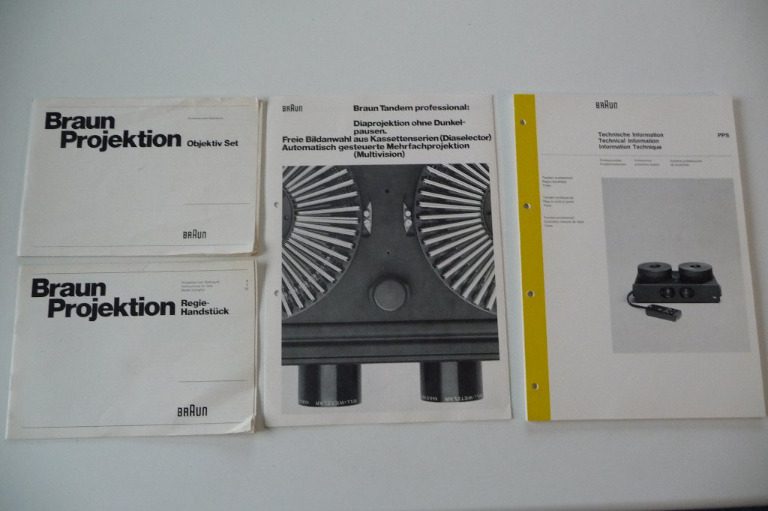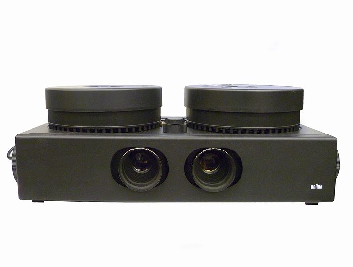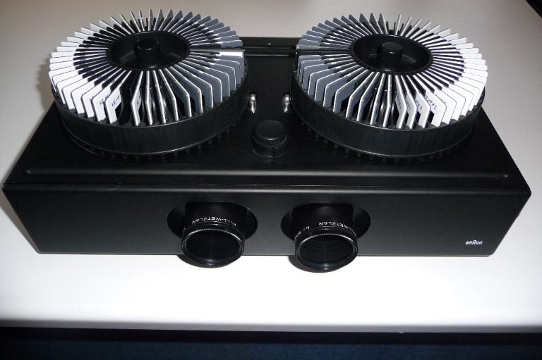 Ungefähre Beschreibung in Deutsch (Descripción aproximada en alemán): Diaprojektoren Tandem