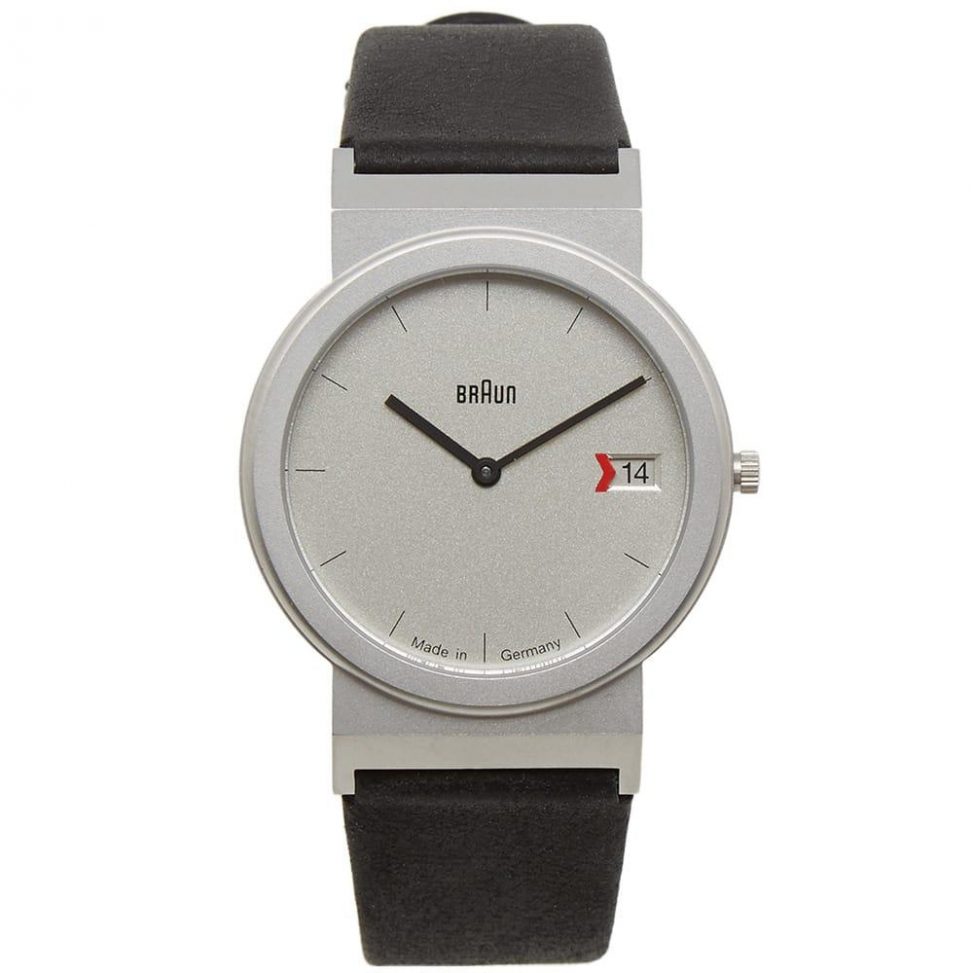 Este sofisticado reloj de pulsera de esfera plateada luce detalles de gran calidad. Dietrich Lubs ha logrado una transición del bisel facetado al asa con una delicadeza excepcional. La relativa complejidad del cuerpo se compensa con una esfera mucho más reducida, sin segundero ni números, el más sobrio de la colección de relojes Braun. Aunque posiblemente más refinado, el diseño recuerda al DW 20 de 1977.