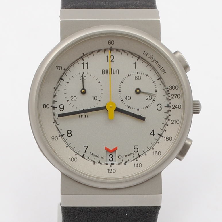 Un reloj deportivo con detalles de gran precisión. Inusualmente, la numeración de la está escrita con tipografía Akzidenz Grotesk, a diferencia de Helvética. Gran cantidad de información organizada con gran claridad y equilibrio en una esfera sorprendentemente pequeña para un reloj de este tipo. La caja con acabado cerámico de titanio mide apenas 32 mm de borde a borde, con un grosor de 7 mm.