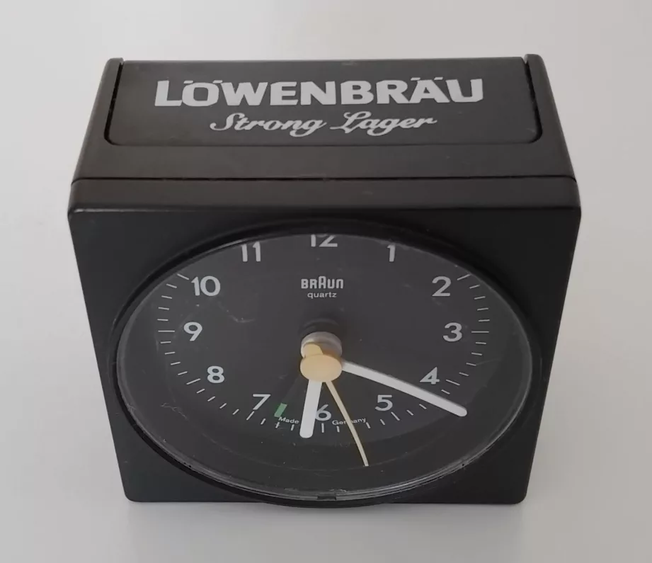Ungefähre Beschreibung in Deutsch (Descripción aproximada en alemán): Tisch- und Weckuhren AB 1 für LOWENBRAÜ