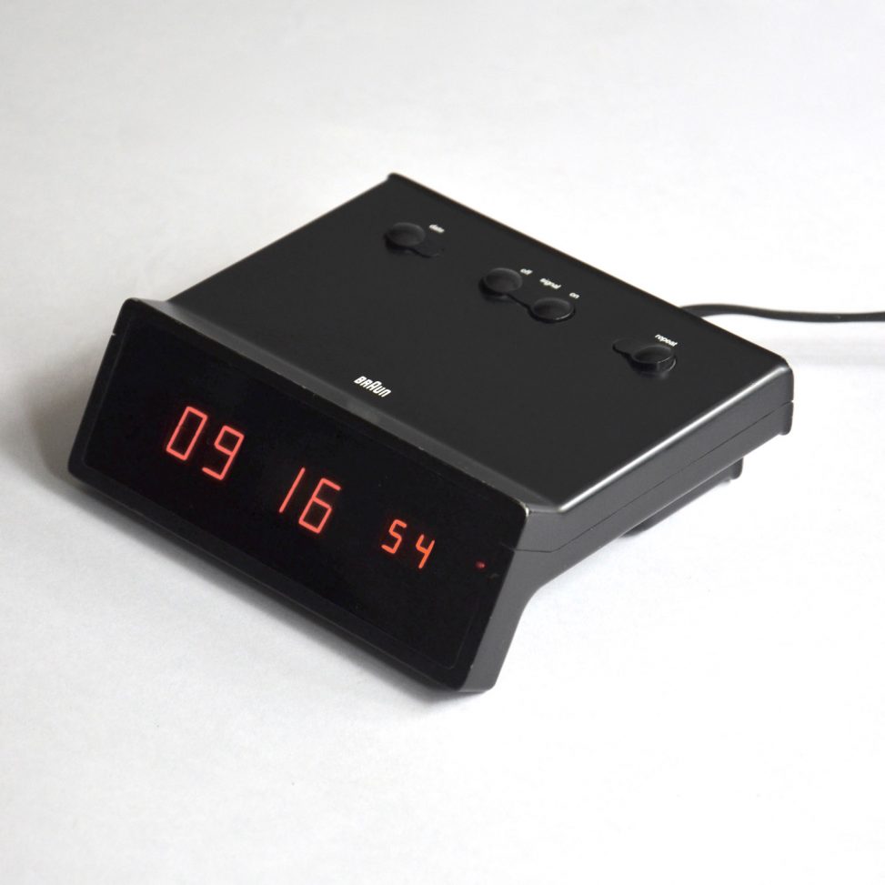 El primer despertador digital electrónico de Braun. Discreta articulación formal de los elementos funcionales: transformador, placa y pantalla. Carcasa metálica con pantalla fluorescente de vacío naranja y sensor de nivel de luz.
