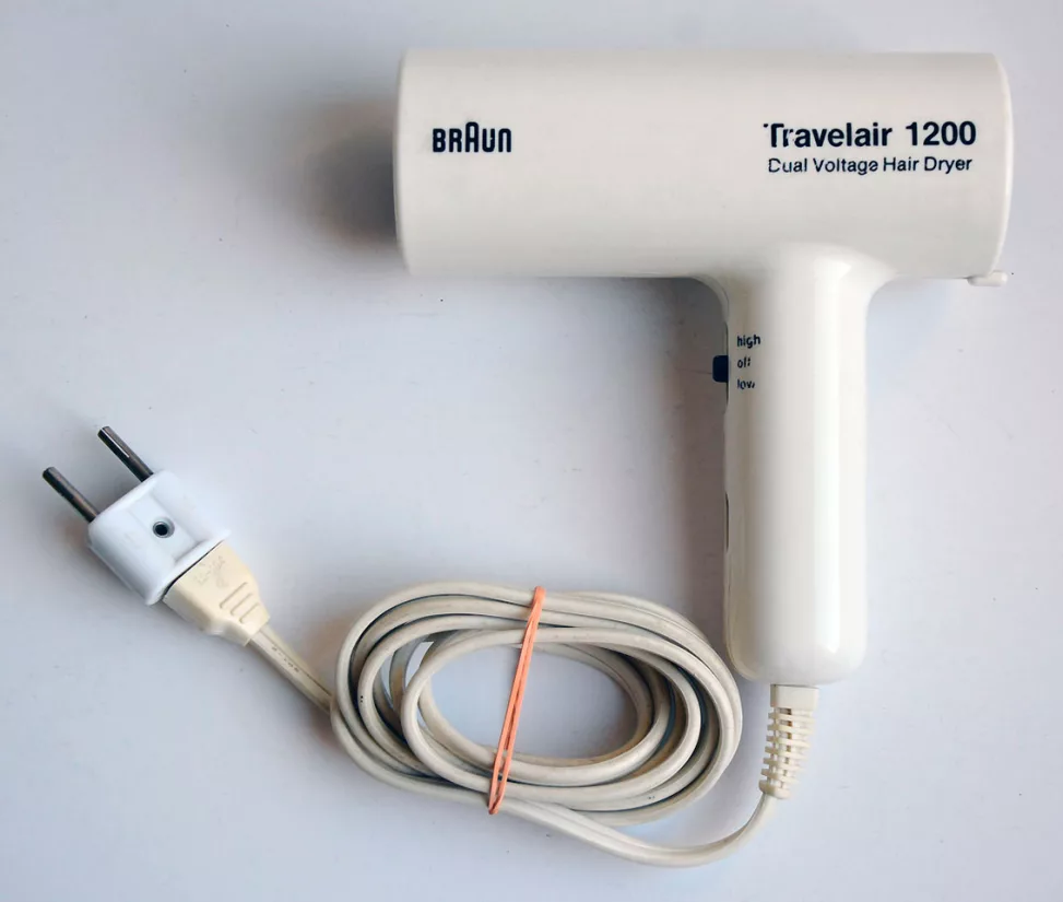 El secador de pelo Travelair 1200 es la adaptación del Promax Compact 1200 de Gillette ( ver aquí ). Su diseño es debe ser atribuido a Robert Oberheim ya que éste el el diseñador de todos los secadores Travelair de Braun.