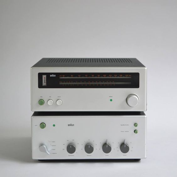 Sintonizador apilable de alta fidelidad compatibles con el PS 500. El acabado de pintura antracita estructurada de la caja, las fijaciones ocultas de la placa frontal y las esquinas suaves establecieron un nuevo vocabulario para el programa de audio, rompiendo con la estética de ingeniería más literalista adoptada a principios de los años 60.