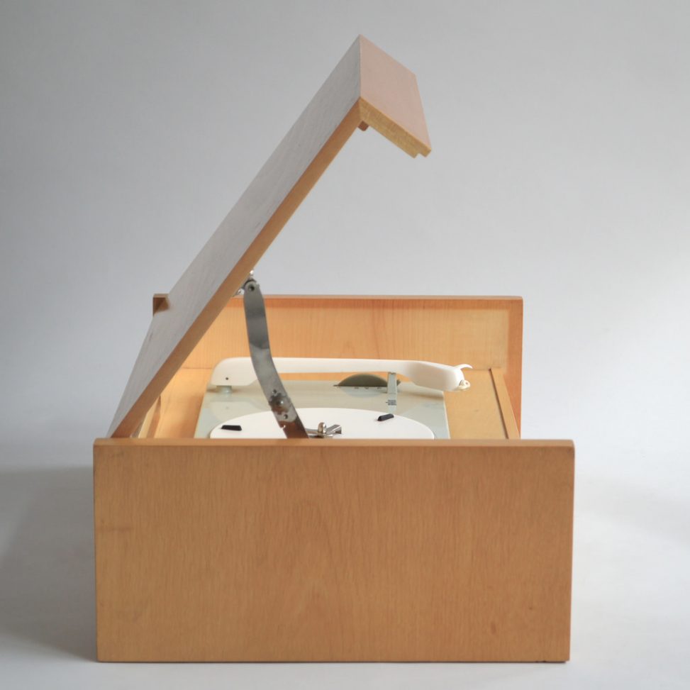 Uno de los diseños fundacionales producidos en 1955, año inaugural del nuevo diseño de Braun, para la Exposición Electrónica de Düsseldorf. Gugelot concibió el tocadiscos G 12 en relación modular con la radio G 11 producida ese mismo año.