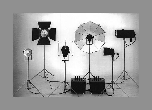 En la imagen se puede apreciar el set de accesorios del sistema profesional de flash para estudio FL 1000, compuesto por trípodes, pantallas de luz y lámparas halógenas….